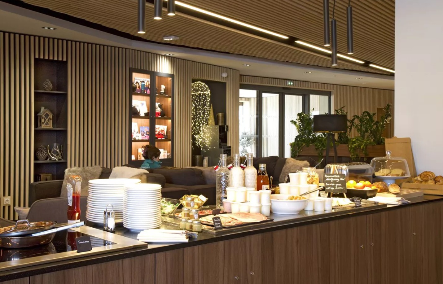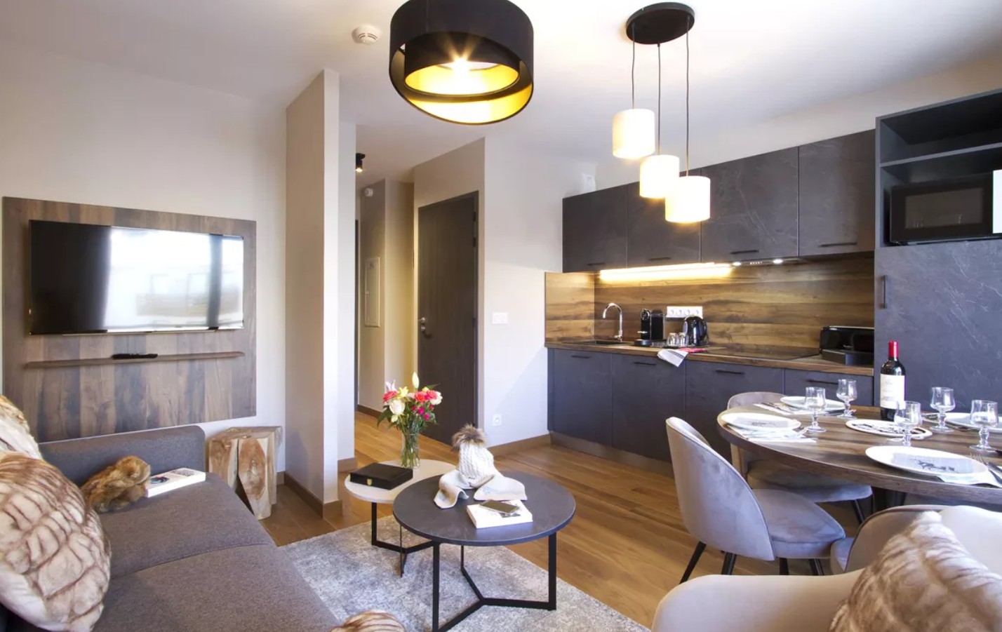 Kitchenette met keramische kookplaat, koelkast, magnetrongrill, vaatwasser, koffiezetapparaat, waterkoker, broodrooster